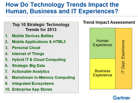 ในงาน Gartner Symposium/ITxpo ที่จัดขึ้นระหว่างวันที่ 22 – 25 ตุลาคม 2555 ที่เมือง ORLANDO รัฐฟอริด้า ทาง Gartner ได้ประกาศแนวโน้มของ 10 เทคโนโลยีเด่น (Top 10 strategic technology trends) สำหรับองค์กร ในปี 2013 โดย Gartner ได้แสดงกราฟสรุปให้เห็นว่า IT Trends ทั้งสิบอย่างมีผลกระทบต่อคน องค์กร และแผนกไอที อย่างไร