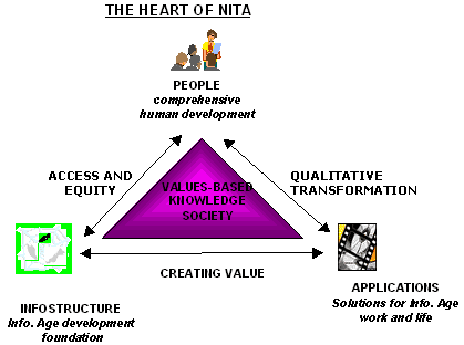 สำหรับแผนแม่บทไอซีทีของมาเลเซียคือ National IT Agenda (NITA) ที่เริ่มมาตั้งแต่ปี  1996  โดยในช่วงแรกได้เน้นเรื่องการพัฒนา Multimedia Super Corridor (MSC) และกลยุทธ์ก็จะเน้นอยู่ในห้าด้านคือ E-Community, E-Public Services, E-Learning, E-Economy และ E-Sovereignty โดย  NITA จะมีองค์ประกอบสำคัญสามด้านคือ คน (people) โครงสร้่างพื้นฐาน (Infostructure)  และ แอพพลิเคชั่น ดังรูป