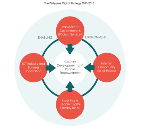 แผนแม่บทของฟิลิปปินส์เป็นแผน 5 ปีตั้งแต่ปี  2011 ซึ่งเป็นแผนต่อจากแผนแรกเมื่อปี  2006-2010 โดยชูคำว่า “Transform 2.0 : Digitally Empowered Nation”  แผนของฟิลิปปินส์จะให้ความสำคัญกับอุตสาหกรรม BPO (Business Process Outsourcing), KPO (Knowledge Process Outsourcing), CPO (Creative Process Outsourcing), ITO (IT Outsourcing)  รวมถึงด้าน e-Government และงานด้านสังคม โดยได้กำหนดวิสัยทัศน์ไว่ว่า