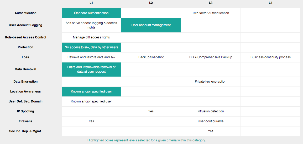 Protection: Assurance that software, computing results, data and etc., cannot be accessed or infringed upon by other users. This includes inter-virtual machine attack prevention, storage block level isolation and hypervisor compromise protection.