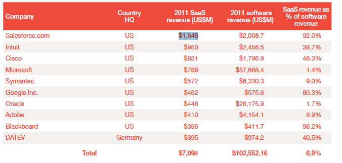 ในแง่ของ SaaS ทาง PwC ได้แสดงข้อมูลของ 10 อันดับแรกของบริษัทซอฟต์แวร์โลกที่มีรายได้จาก SaaS สูงสุด ซึ่งอันดับหนึ่งคือ Salesforce ที่มีรายได้ $1,848 ล้านเหรียญสหรัฐ และยังพบในปัจจุบันสัดส่วนรายได้ซอฟต์แวร์ที่มาจาก SaaS ยังมีเพียง 5% จากรายได้ทั้งหมด แต่คาดการณ์ว่าจำนวนสัดส่วนนี้จะเพิ่มเป็น 25% ในปี 2016 นอกจากนี้ยังพบว่าบริษัทซอฟต์แวร์ที่เกิดใหม่ในปี 2012 ร้อยละ 82 จะจำหน่ายซอฟต์แวร์ในแบบ SaaS มากกว่าแบบ Packaging Software