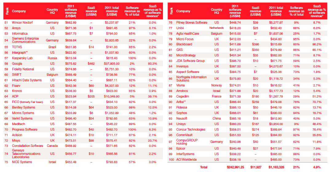 ทั้งนี้ข้อมูลของ Top 100 Software Companies ของโลกเป็นไปดังตารางนี้ (ข้อมูลจาก Global Software Business Strategies Group ของ IDC)