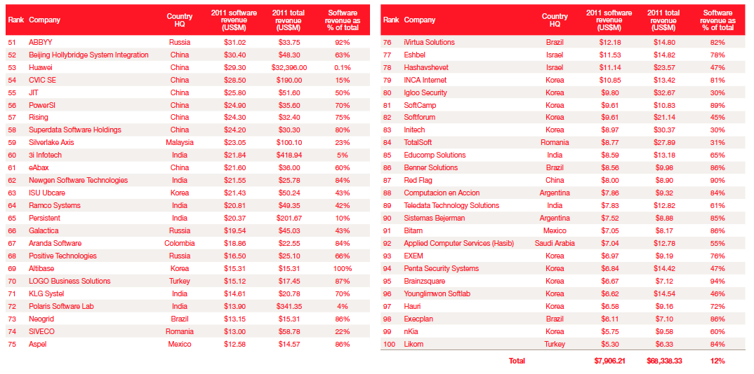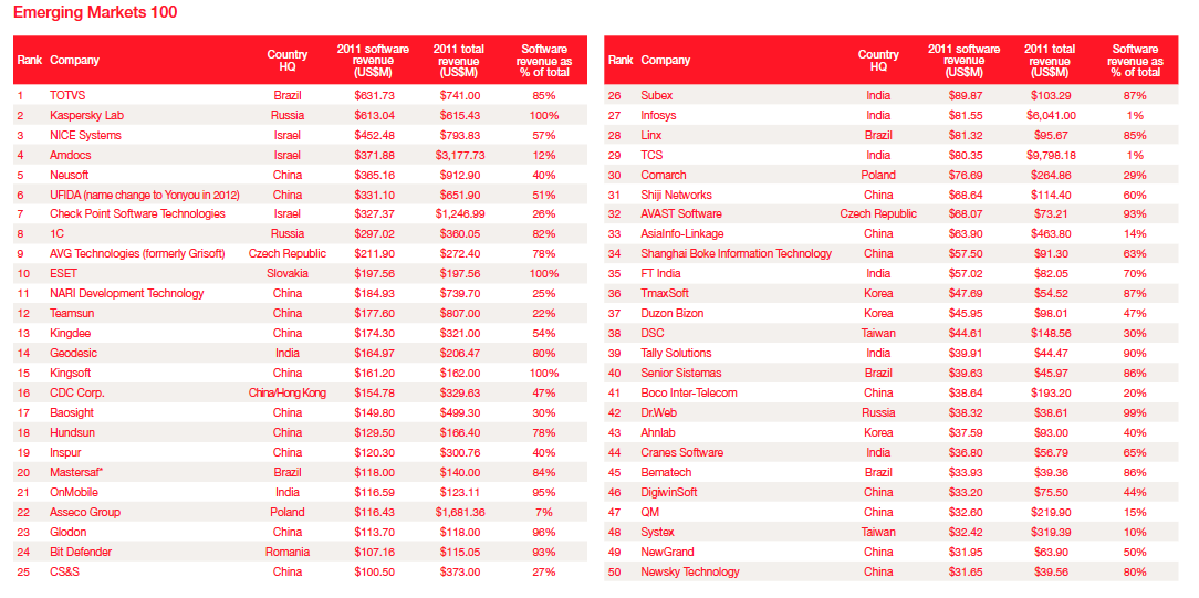 ทาง PwC ยังจัดอันดับบริษัทซอฟต์แวร์ในตลาดกลุ่มประเทศเกิดใหม่ทางด้านอุตสาหกรรมซอฟต์แวร์เช่น ประเทศจีน อินเดีย บราซิล รัสเซีย หรือประเทศอื่นๆ จะเห็นว่าบริษัทที่ติดอันดับ Top 100 จะอยู่ในประเทศจีนส่วนใหญ่โดยจะมีรายได้ของบริษัทที่ติด Top 100 รวมกัน $2,738 ล้านเหรียญสหรัฐ ตามมาด้วยบริษัทจากอิสราเอลที่มีรายได้รวมกัน $1,174 ล้านเหรียญสหรัฐ โดยมีรายชื่อของบริษัท Top 100 ดังนี้
