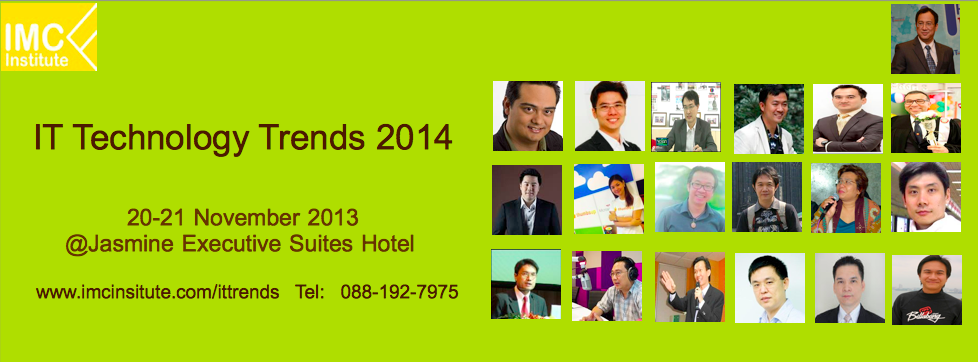 จากข้อมูลที่กล่าวมาทั้งหมดนี้ หลายท่านก็อาจเห็นว่าแนวโน้มเทคโนโลยีต่างๆเหล่านี้ หลายๆอย่างอาจยังไม่ใช่แนวโน้มในปีหน้าของบ้านเรา ซึ่งผมเองได้เขียนบล็อกสรุป Technology Trends 2014 ของบ้านเราวไว้ในอีกบทความหนึ่งเมื่อเดือนกันยายน (สามารถดูได้ที่ >> IT Trends 2014) นอกจากนี้หากท่านสนใจเรื่องของแนวโน้มเทคโนโลยีไอทีของบ้านเราในปีหน้า ทาง IMC Institute กำลังจะจัดงานสัมมนา IT Technology Trends 2014 ในวันที่ 20-21 พฤศจิกายนนี้ โดยได้เชิญผู้เชียวชาญด้านไอทีของประเทศไทย 19 ท่านมาบรรยายให้เห็นแนวโน้มและวิเคราะห์ตลาดในปีหน้า (สามารถดูรายละเอียดของงานได้ที่ >> IT Technology Trends 2014 )