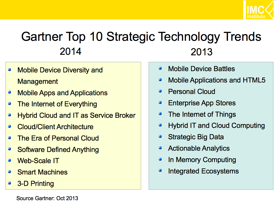 - The Internet of Everything: Gartner เคยใช้คำว่าThe Internet of things มาหลายปีและเน้นให้เห็นว่าอุปกรณ์เชื่อมต่ออินเตอร์เน็ตขยายไปมากกว่าเครื่องพีซีและอุปกรณ์โมบาย โดยมีอุปกรณ์อื่นๆที่สามารถเชื่อมอินเตอร์เน็ตได้มากขึ้นเช่น ทีวี นาฬิกา หรือ รถยนต์ แต่อย่างไรก็ตามบริษทต่างๆและผู้ผลิตเทคโนโลยีก็ยังไม่ได้ขยายการนำอินเตอร์เน็ตเข้ามาใช้ในอุปกรณ์ใหม่ๆเหล่านี้มากนัก บริษัทต่างๆะต้องเปลี่ยนรูปแบบการทำธุรกิจที่จะต้องไม่จำกัดขอบเขตของตัวเองเป็นเพียงแค่ The Internet of things (กล่าวคือเน้นเฉพาะอุปกรณ์) แต่ควรขยายขอบเขตไปเป็น The Internet of Everything (กล่าวคือครอบคลุมทั้งอุปกรณ์ คน ข้อมูล และสถานที่)
