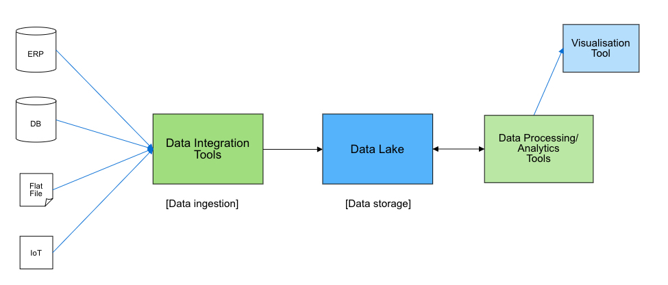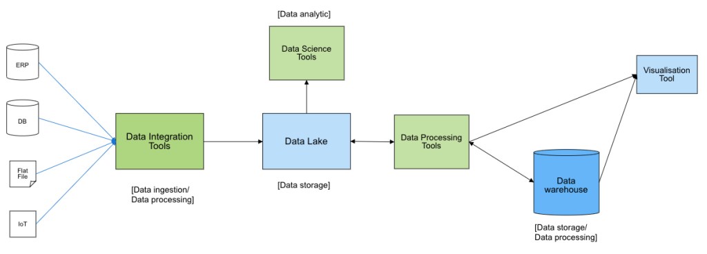 - Processing/Analytics ในการประมวลและวิเคราะห์ข้อมูลที่อาจแบ่งเป็น Batch Processing/Analytics และ Real-time Processing/Analytics