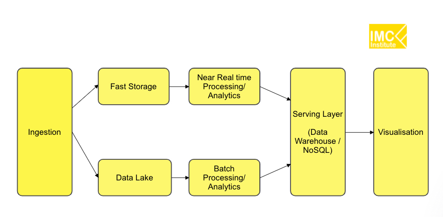 - Serving layer ที่อาจเป็น Data Warehouse หรือ No SQL ที่จะทำหน้าที่เก็บผลลัพธ์ของการประมวลผลข้อมูลทั้งสองแบบ